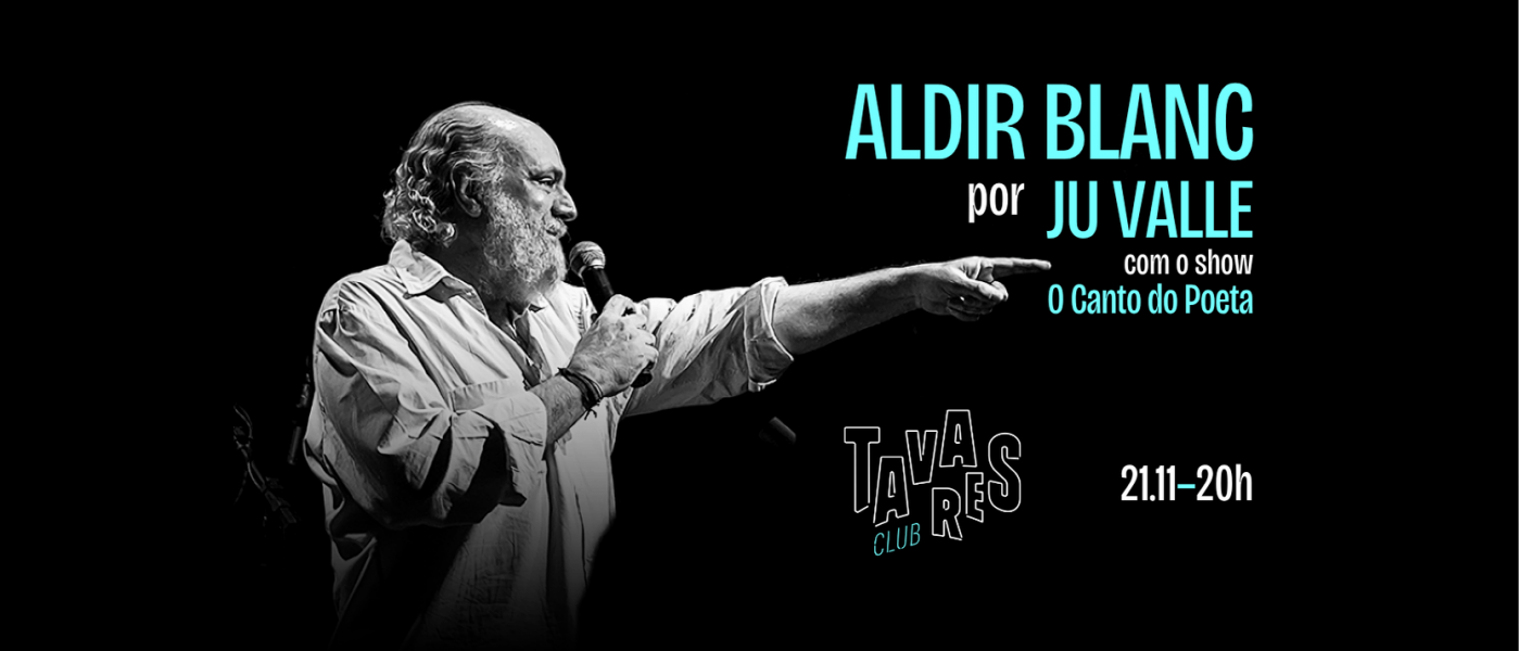 No dia 21/11, o Tavares Club apresenta Ju Valle no show O Canto do Poeta, uma homenagem ao letrista Aldir Blanc, mestre em transformar o cotidiano brasileiro em literatura. Com humor, melancolia, raiva e ternura, suas letras – parceiras de João Bosco, Guinga e Moacyr Luz – são crônicas das esquinas e da alma nacional, resistindo ao esquecimento e ao tempo.